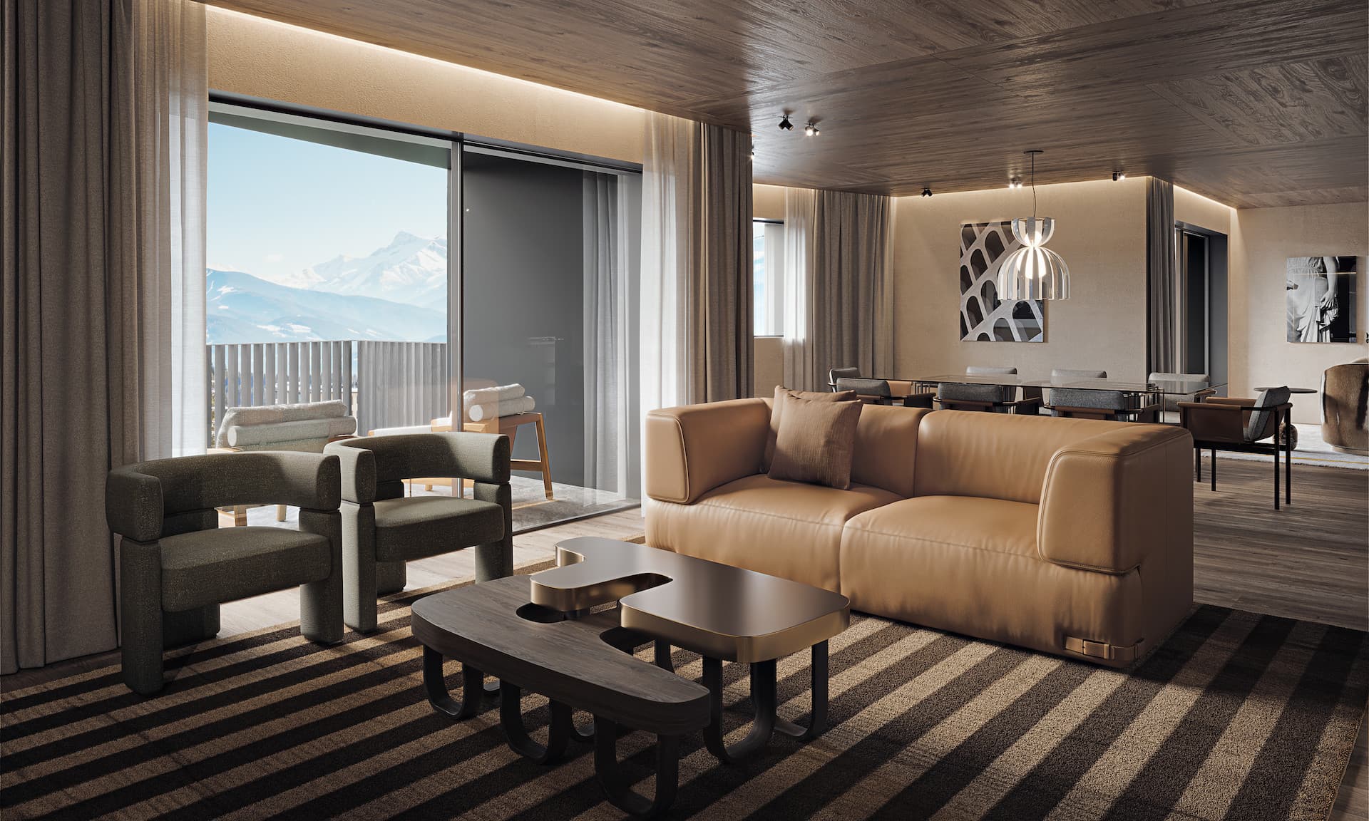 There’s elegance amongst the pines in Crans-Montana. The FENDI Private Residences compound, perfectly harmonized with the surrounding nature of the Swiss Alps, provides a sophisticated setting against a backdrop of snow-capped mountains and lush gardens.