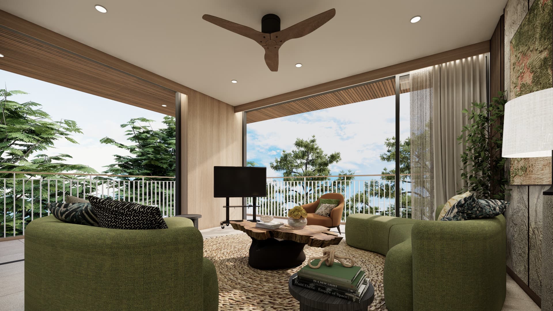 Interiors showcase a sophisticated natural palette of light wood, warm earth tones, stone textures, and organic shapes that create spaces of tranquil beauty and timeless appeal.